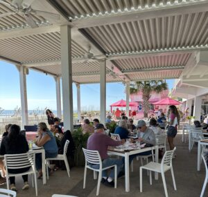 Pinky’s – what a great location!  Right on the beach with a great view of sand and ocean.  That’s Cleon and our friend Matt sitting right at the front center table.