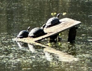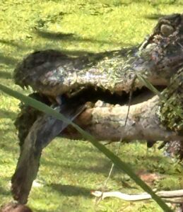Even though we were in Charleston, SC in November, the gardens and parks were still beautiful. The weather was balmy – the sky an incredible blue the entire week. We spent a day at the Magnolia Plantation. The house tour was excellent. We did take the nature tram tour but for me, it was disappointing. Instead of nature, there was a whole lot of history. I like history and our guide inside the house was just wonderful – a perfect blend of fact and stories. I could have listened to her all afternoon. But when I go on a ‘Nature Tour’ tram, then what I expect is for the guide to talk about nature. I want to know about the all trees we are passing, the birds we are seeing and hearing, the perennials planted in the garden beds, how all of it is maintained to such a high standard, what other animals live on the property. And who designed the gardens? What is native? What plants and trees were brought from outside the southeastern U.S.? What was here before the original builder and landscaper started changing everything? And there was little of that. The only ‘nature’ the guide talked about was alligators. Lots and lots of talk about alligators. And as you can see by these photos, we saw several. And a few turtles. From the comments I heard as we all disembarked at the end of the tour, I was the only one who was disappointed – everyone else loved the tour. It seems this tour is giving the people what they want – alligators!