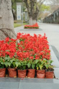 What an interesting idea! I have never seen annual Salvia used this way before. One plant per pot and massed together under a tree. These plants must get enough sun as they are healthy and blooming very well! The downside would be they would have to be watered probably every day during the hot months of the summer. But they look great! Photo by Film on Unsplash.