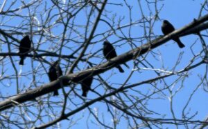 Right now, there are both male and female Brown-headed Cowbirds at our feeders and in all three of our birdbaths.  That will change – soon, it will only be the males you see.  In a week or 2, the females will not have time to hang around our trees and feeders like these males are doing.  They will be too busy sneaking around looking for unattended nests in which to lay their legs.  But this small group of males is so typical of their behavior this time of year.  Up in our trees – generally together and chatting.  Just hanging out like guys at the local bar!