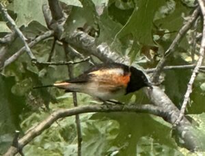 This morning, still sitting at my desk working, here was what was in just about the same place in that tree – a male American Redstart! And so easy to identify. The striking colors. The constant flitting. The constant opening and closing of his tail – flicking it. And of course, he does that to startle insects into moving and then, bam! Breakfast.