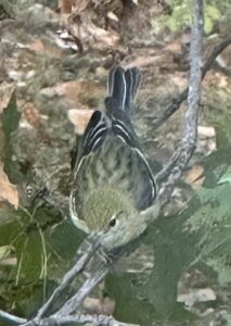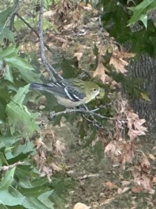 I was sitting at my desk on our second floor and working on the changes to this website that I talked about in the 10/1 blog. Just outside my windows is a very large and fully leafed-out pin oak tree. I saw a bird flitting a bit, in and around the leaves, and at first glance, I thought it was a female American Goldfinch. Those of you who watch the livestream from our bird feeders know we do have goldfinches, and the number increases in fall until we have more than a dozen through the winter months. But something about this quick ID based on a fleeting glimpse seemed just not right. So, I stopped what I was doing and started watching. I grabbed my cell phone, put the camera on its strongest zoom, and here are the photos I got.