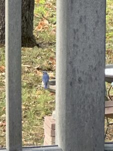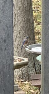 Cleon and I were sitting on the deck – which is why these photos were shot through the railing. We tried not to move, and I was so careful how I raised my cell phone. We did not want to scare these Eastern Bluebirds who were at the bird baths at the bird feeder area.