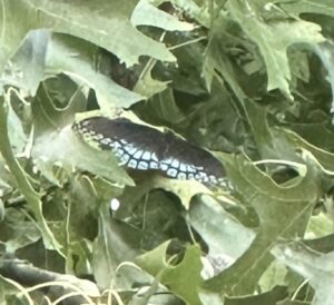 We have very few to no butterflies and moths here in spring and summer. I have a lot of flowers planted for them, but they are most often unused. We do get some butterflies and moths in late summer and fall. This year in September – and now October – we have had more of both than in all the 20 years we have lived here put together! It has been wonderful. Here is one (left photo) I saw in that magical pin oak tree so close to my window. It rested for almost 15 minutes, then moved on. I have never seen a butterfly rest that long in a tree so new behavior for me.
