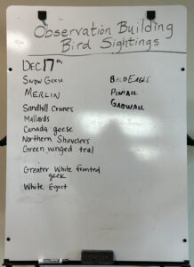 But I think the pièce de résistance is their “extra” building. Cleon and I have been to many national wildlife refuges all over the country and every one of them had a good viewing area for birds – most often it is of a feeder area which sometimes includes a bird bath. Occasionally it is a view out over a pond or small lake. These viewing areas are inside the Visitor’s Center and most often are a large wall of windows with close-by chairs or benches. Sometimes there is a sound system so you can hear the birds. Sometimes binoculars will be provided. But Wheeler is different – and in my opinion, so much better. Their wildlife viewing area is actually in a whole other building from their large Visitor’s Center. There is a smooth, fairly wide, and flat trail that leads from the Visitor’s Center and parking lot to this extra building. And it is a big building.