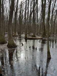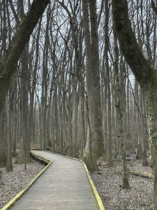 It was explained to us there might not be a great many songbirds on the trails this time of year, but we were directed to the Beaverdam Swamp Boardwalk Trail. The parking area for the trail was just on the other side of the guardrail for I-565 so as you can imagine, the first part of this 1-mile trail was noisy. But once we were about 100 yards down the trail, the noise of the interstate receded until we did not hear anything at all. This trail is flat and well maintained. The first part has a surface of crushed granite which leads to the boardwalk. The boardwalk trail winds its way through the swamp until it ends at a viewing area at a stream. The trees are mostly black tupelo – beautiful trunks and bark.